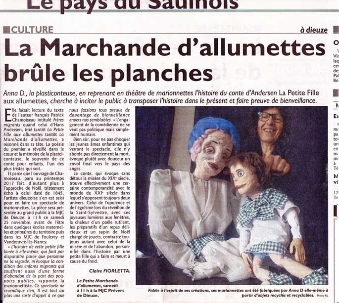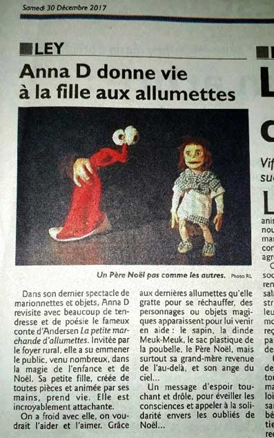 Inspiré du conte d'Andersen, cette histoire, remise au goût du jour, évoque sans conteste Où sont ses parents ? Cette enfant privée de ses parents, privée de tout, se verrait-elle aussi privée de l'enfance ? Une histoire triste, certes, mais un spectacle où l'humour est rendu présent grâce aux objets qui s'y animent .. car le monde de l'enfance se joue des drames, et tant que l'enfant vit, il rit.